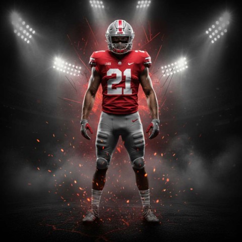 AI Prompt: cinematic portrait of an Ohio State football player, number 21 , posing in the center, full body shot, super realistic, ultra detailed, 8k, dramatic poster design for the background, smoky, scarlet red colors, scattered glowing embers coming from the bottom, stadium lights.
