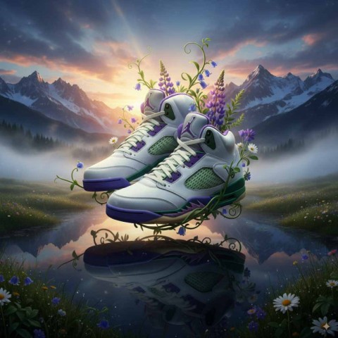 AI Prompt: Create a hyperrealistic, cinematic poster featuring a pair of floating sneakers (inspired by back-to-school shoes, styled like Grape 5s) hovering above a reflective alpine meadow at sunrise. Vines and wild flowers curl around the shoes as if nature is lifting them. Mist rolls in the background, with snow-capped peaks under a dramatic sky. The sneakers glow with soft rim light, giving them an almost divine aura. DSLR-style photorealism with cinematic metallic details.
