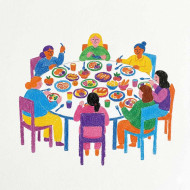 AI Prompt: vibrant oil pastel and colored pencil illustration of several people sitting around a round dining table with food, drawn in bright vivid pigments on white textured paper minimal bauhaus-inspired naive composition, visible pastel grain and rough strokes, cozy atmosphere, simple hand-drawn figures, isolated on white background.