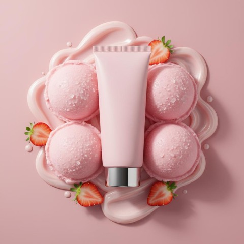 AI Prompt: Ultra-realistic professional product photography: a pastel pink cosmetic tube surrounded by scoops of strawberry sorbet and creamy strawberry lotion swirls. The sorbet looks glossy, fresh, and slightly melting, with icy texture and natural color gradients. Smooth reflections, soft daylight studio lighting, delicate shadows. The background is a matching pink gradient, minimal and elegant. Luxurious skincare advertisement aesthetic, cinematic composition, 8K resolution, hyper-detailed textures, beauty campaign style.