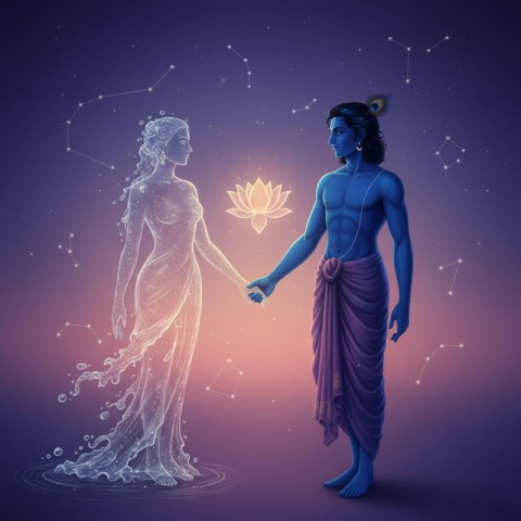 AI Prompt: A surrealist, dream-like portrait of Radha and Krishna. The image has a clean, minimalist aesthetic with a touch of modern design. Radha’s figure is translucent and ethereal, like she is made of flowing water, while Krishna is solid and vibrant, with deep blue skin. They are holding hands, with a single, glowing lotus flower between them. The background is a gradient of soft, cosmic colors—deep blues, purples, and pinks—with stylized constellations visible. The style should be reminiscent of a fine art poster, with a sense of wonder and divine transcendence. The focus is on the abstract symbolism of their forms and the eternal nature of their love.