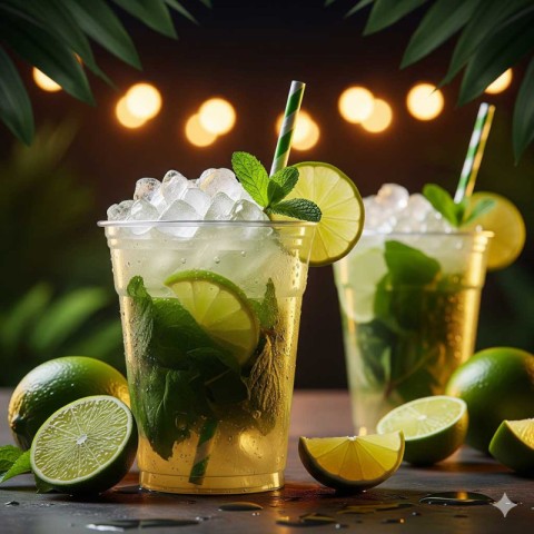 AI Prompt: A tropical and vibrant scene featuring two refreshing mojito cocktails. The transparent plastic cups are filled with crushed ice, fresh mint leaves, and lime slices, with a green-and-white striped straw in one of the cups. The first mojito is in the foreground, illuminated by soft lighting that enhances the drink’s refreshing glow, while the second one is slightly blurred in the background. Surrounding the drinks are whole and sliced limes, with visible droplets of juice adding to the fresh ambiance. The setting is an outdoor night party, with warm, blurred string lights creating a cozy and inviting atmosphere. Tropical foliage frames the scene, adding a natural touch. The composition has a cinematic focus, with a slight background blur and bokeh effect from the night lights, giving it depth. Vibrant colors of green, yellow, and warm ambient tones create an appealing and sophisticated look.