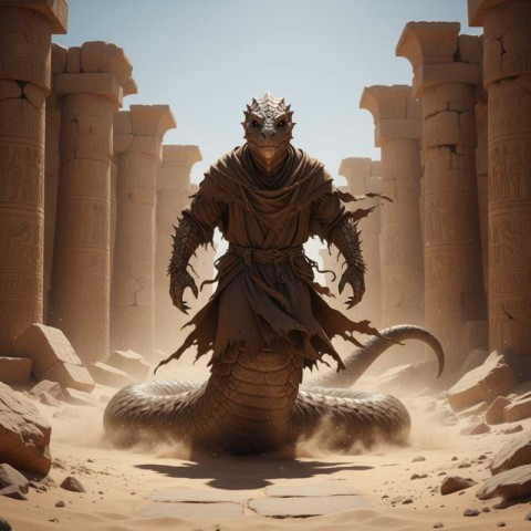 AI Prompt: A reptile person with a snake bottom half, wearing tattered brown robes, slithering through a ruined desert temple at high noon. Scales are sun-baked brown, eyes are black, and sand swirls around the temple's base.