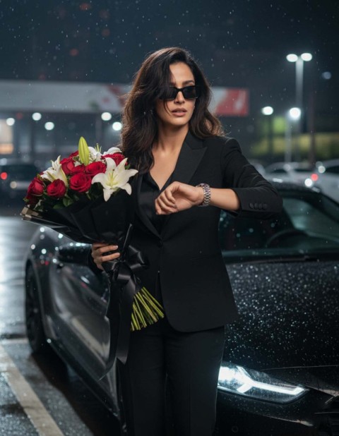 AI Prompt: Hyper-realistic cinematic 9:16 portrait based on the uploaded image, keeping the same face and messy hair over the eye of a stylish woman standing in a modern city parking lot at night, beside a sleek black luxury car. He is wearing a fitted black cozy suit, black shirt, and black trousers, accessorized with a luxury wristwatch and dark [The sentence is cut off here, but context suggests "sunglasses" or another dark accessory]. In one he holds a bouquet of fresh [likely "flowers"] wrapped in elegant black paper with ribbon while checking his with the other hand, [The sentence is fragmented and may contain typos, likely reading: "while checking his watch with the other hand"] as if awaiting. Face reference 100%.