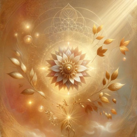 AI Prompt: A perfectly symmetrical golden Flower of Life glowing at the center, radiating a soft golden halo. Background in smooth pastel autumn tones (amber, warm beige, golden ivory). A few delicate golden and amber leaves gently floating around the symbol, as if carried by a light breeze. Subtle sparkling particles and soft mist add depth, creating a poetic, sacred, and serene atmosphere. Vertical cinematic composition, designed for Instagram Story format 1080x1920. Hyperrealistic yet elegant, luminous sobriety, premium artisanal aesthetic, no CGI, no sci-fi look.