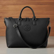 Ai Prompt: Large structured weekend tote in black vegan leather, embossed HBH emblem centered, wide base, long strap and