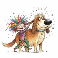 AI Prompt: Whimsical children's book illustration in the style of Quentin Blake and Oliver Jeffers, a scruffy child with explosive multicolored messy hair and patched, striped clothes, interacting with a large, shaggy, big-nosed dog. The style features loose ink outlines, watercolor textures, and scribbly details on a clean white background. The mood is playful and charming, high detail, vibrant colors.