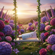 AI Prompt: A whimsical skincare product ad with the product tube resting on a wooden swing, surrounded by an abundance of vibrant purple and pink flowers, including roses and hydrangeas. The swing is hanging from vines, creating a natural, enchanting setting. The background is a soft, blurred landscape under a warm, glowing sky, possibly at sunset or sunrise. create a image