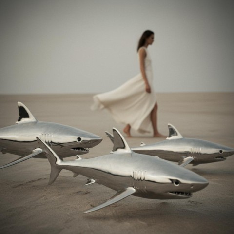 AI Prompt: A cinematic photorealistic editorial still of a woman in a flowing white dress walking barefoot, walking next to metallic-silver sharks floating next to her, low-angle ground-level perspective tightly focused on the sharks in the foreground with the model softly out of focus in the background, shallow depth of field with razor-sharp shark skin and teeth detail, soft diffused overcast natural light with gentle top/side fill, muted desaturated warm-gray and beige palette, subtle film grain and slight vignette, editorial fashion mood, Canon EOS R5 35mm lens at f/2, high resolution, cinematic color grading.
