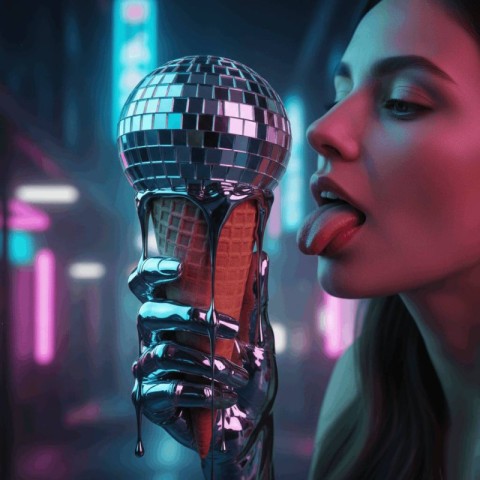AI Prompt: Ultra realistic photography with surrealistic elements of woman’s hand holding ice cream cone. The ice cream is a disco ball with chrome metallic drips melting down the hand and cone. Woman leaning in with tongue out about to lick the cone.