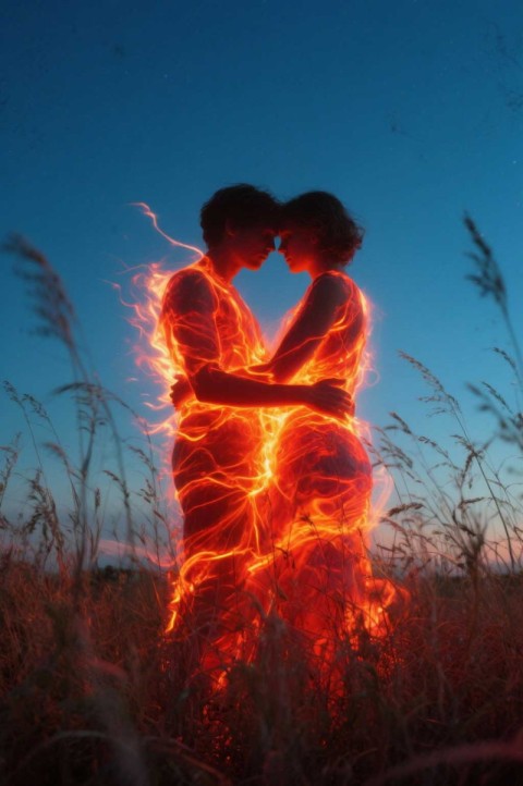 young couple bodies glow intense fiery orange red lights with neon glowing fiery woman glowing couple images love relationship two lovers face body digital art smiley smiling grass lightings woman lady girl man person boy fire ai prompt ai imagesSimilar Photos