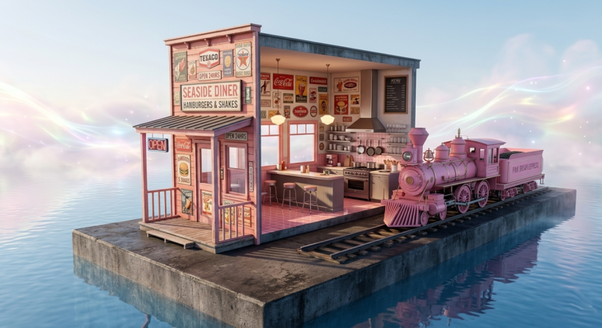 Step into a surreal architectural dream featuring a pink Western-style restaurant set high above calm sea waters on an isolated platform. This visually captivating scene blends supernatural aesthetics with flowing light, soft pastel tones, and cinematic composition. A matching pink train sits beside the restaurant, enhancing the imaginative and futuristic atmosphere.