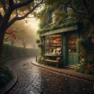 AI Prompt: A green bookshop on the side of an old cobblestone street, surrounded by trees and ivy, with leaves scattered across the road after rain, exuding a romantic charm and bathed in natural light.