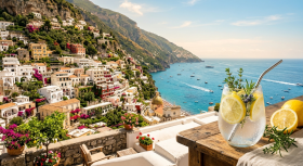 A breathtaking luxury summer scene set along the iconic Amalfi Coast in Italy, featuring bright white Mediterranean architecture cascading down a dramatic cliffside overlooking the turquoise blue sea. Bathed in warm golden sunlight, the image captures a serene coastal atmosphere with soft shadows and glowing highlights. In the foreground, a refreshing glass of sparkling lemon water with fresh lemon slices and aromatic herbs rests on a rustic table, enhancing the elegant, relaxing seaside lifestyle. Perfect for travel inspiration, luxury branding, and Mediterranean-themed designs.