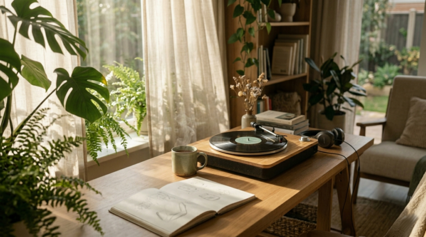 slow living banner cozy workspace aesthetic ambient music vibe minimalist creative space warm sunlight interior earthy tone design sage green beige palette vinyl record aesthetic headphones music setup calming lifestyle banner soft focus photography natural textures decor peaceful home workspace cinematic composition design relaxing background bannerSrnp