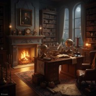 Roaring Fireplace Study Room with Vintage Gadgets Antique Maps and Explorer Desk