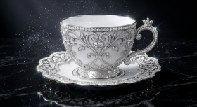 Experience the elegance of an ultra-luxury jeweled teacup crafted from radiant white porcelain and refined platinum, adorned with brilliant crystalline diamonds and intricate platinum vine filigree. This masterpiece showcases hyper-detailed sparkle reflections and shimmering crystal dust floating in the air, creating a truly mesmerizing visual.