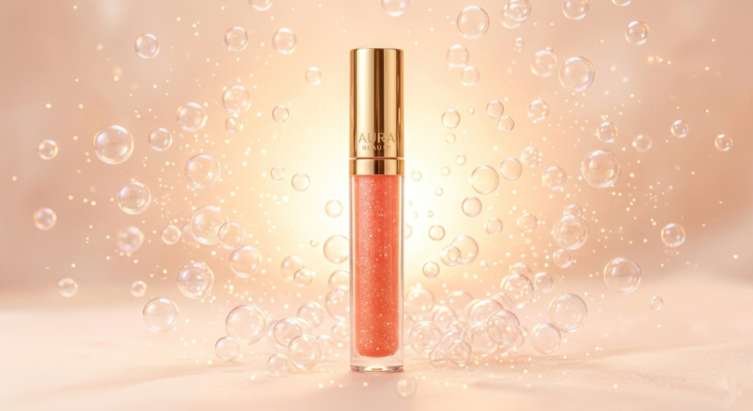 Coral Peach Lip Gloss with Gold Cap and Sparkling Bubbles