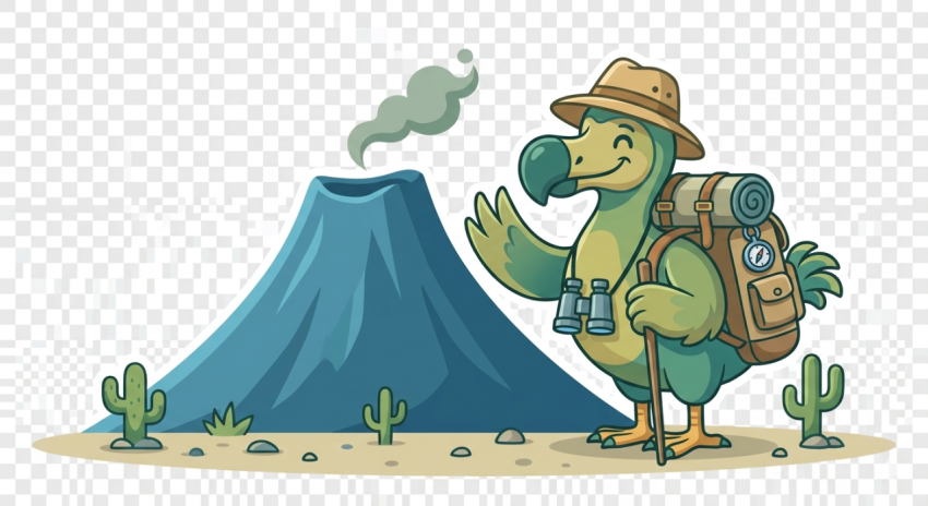 Cute Dodo Bird Explorer Mascot Logo with Volcano