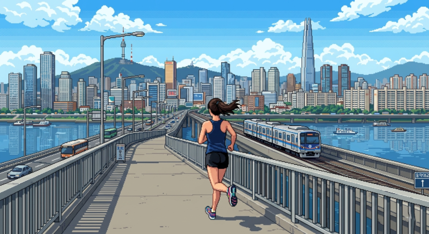 Cute Pug and Girl Walking Through a Colorful Morning Market