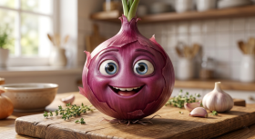 A 3D realistic cartoon-style purple onion character featuring expressive eyes and a mouth, designed as a cute and engaging food mascot. This creative digital illustration blends realism with playful animation, making it perfect for branding, advertising, children’s content, and fun visual storytelling in the food and design industry.
