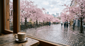 A serene and cinematic spring scene captured through a cozy cafe window on a rainy afternoon. A warm cup of latte rests on a wooden table while raindrops cling sharply to the glass, creating a soothing foreground texture. Outside, cherry blossom trees line a quiet street in full bloom, with delicate pink petals drifting gently in the breeze. The softly blurred city background and shallow depth of field enhance the calm, peaceful mood, while warm natural tones and diffused cloudy light add to the inviting atmosphere. With its minimal composition and open center space, this image is perfect for text overlays, lifestyle content, and aesthetic visual storytelling.
