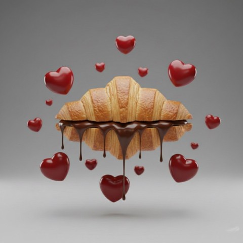 Golden Crispy Croissant with Flaky Layers and Floating Red Heart Shapes