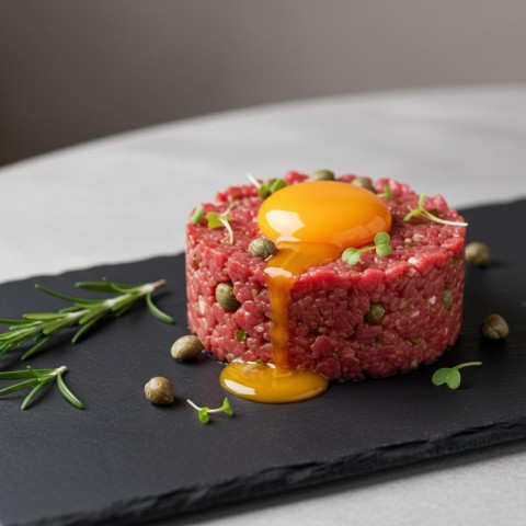 AI Prompt: A photograph of a gourmet beef tartare presented on a sleek black slate plate. The finely chopped raw beef is vibrant red, topped with a bright orange egg yolk slowly dripping down its surface, accented by scattered emerald microgreens and tiny briny capers. a single sprig of fresh rosemary rests delicately alongside the tartare, providing a subtle aromatic touch. Soft, diffused light illuminates the scene from above, creating a glossy, magazine worthy aesthetic and highlighting the texture and richness of the dish.