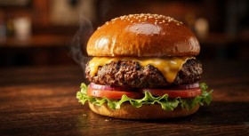 Premium gourmet burger placed on a dark wooden surface, featuring a juicy beef patty, fresh ingredients, and restaurant-style presentation. Perfect for food photography, menu design, restaurant promotions, fast food advertising, and culinary branding with a rustic, high-end aesthetic.