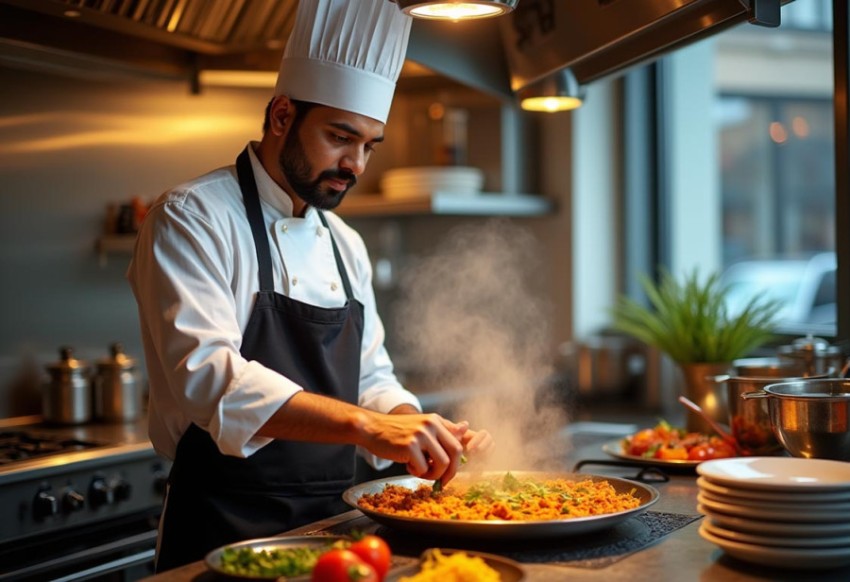 healthy meat breakfast tomato indian chef preparing delicious dish ai image vegetables nonveg kitchen indian food indian spices cooking professional chef traditional food chef coat modern kitchen hotel kitchen smiling chef restaurant service food preparation indoors portrait dinner lunch expression mirchi gas stoveSimilar Photos