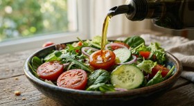 Fresh olive oil being poured over a colorful vegetable salad, highlighting a healthy food concept inspired by the Mediterranean diet. This vibrant scene features fresh vegetables and natural olive oil dressing, symbolizing clean eating, balanced nutrition, and a healthy lifestyle. Perfect for healthy food blogs, nutrition content, and culinary inspiration.