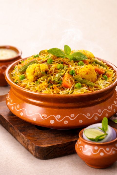 A mouthwatering banner image of hot Indian vegetable biryani served in a traditional pot, showcasing aromatic basmati rice, fresh vegetables, and rich spices. The steaming presentation highlights the freshness and authentic taste of Indian cuisine, making it perfect for restaurant menus, food promotions, and culinary marketing content.