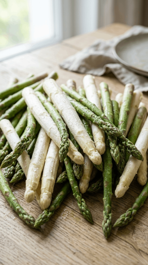 An ultra-realistic food photography shot featuring fresh green and white asparagus piled naturally with glistening water droplets, highlighting their crisp texture and farm-fresh appeal. Captured in soft daylight with a clean, friendly mood, this high-end editorial-style image uses shallow depth of field and macro detail to emphasize freshness and quality. Shot with an 85mm lens in vertical framing, it’s perfect for food blogs, healthy eating promotions, restaurant menus, and organic produce branding.