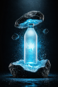 A visually stunning concept image of a glowing ice water bottle surrounded by crystal-clear ice and rugged stones, creating a premium cold drink aesthetic. The cool blue lighting and floating ice elements highlight freshness, purity, and hydration. Perfect for beverage branding, product advertising, and modern marketing campaigns focused on refreshing and high-quality drinks.