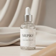 AI Prompt: Mepiks' niacinamide face serum, luxury skincare brand, transparent glass dropper bottle with minimal elegant label "Mepiks'" description on the bottle small luxury font "Serum with PHA acids" ", clear serum texture, hyaluronic acid hydration concept, Vitamin B3 molecules, clean beauty aesthetic, soft neutral background, premium cosmetic advertising, gentle natural light, smooth skin concept, hypoallergenic skincare, modern minimalist design, ultra realistic product photography, 8k, high detail