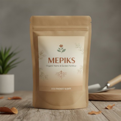AI Prompt: Minimalist and elegant label design for an organic home and garden fertilizer brand called "MEPIKS". Clean layout, premium natural aesthetic, soft earthy tones, subtle botanical illustrations, modern sans-serif typography, eco-friendly look, spacious composition, high-end product packaging, gentle gradients, professional label design, natural texture accents, trustworthy and safe appearance, sophisticated and organic branding style.