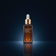AI Prompt: Ultra-minimal luxury product film still. Estée Lauder Advanced Night Repair serum bottle standing upright on a deep midnight-blue reflective surface. Reflection is softer and lighter blue, never mirror-sharp, slightly diffused. Dark blue environment, near-black shadows, timeless heritage luxury mood. Single sculptural light source with soft falloff, no glow, no flare. Glass density clearly visible, liquid depth inside bottle perceptible. No people, no hands, no droplets, no splashes, no scientific props. Camera is steady, composed, authoritative. Quiet power, restraint, permanence. Editorial product photography, museum-grade still, cinematic, print-ready.