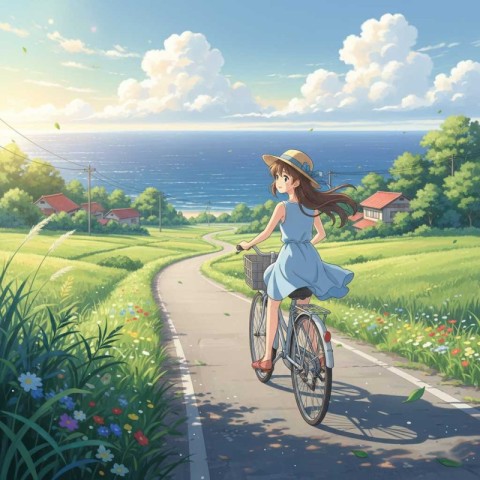 AI Prompt: A nostalgic Japanese anime-style scene of a young girl riding a bicycle down a gentle hill on a rural road, with the ocean visible ahead. Warm summer light, soft breeze, flowing hair, peaceful countryside scenery, dreamy and emotional mood, hand-drawn anime illustration, vibrant yet gentle colors.