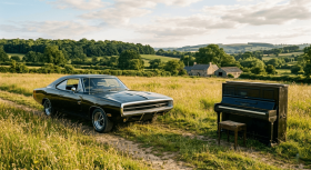 A striking cinematic scene featuring a black classic muscle car positioned in an open field alongside a piano, blending automotive elegance with artistic surrealism. This unique composition captures a moody outdoor atmosphere, combining vintage car aesthetics with creative storytelling, perfect for fine art, automotive photography, and conceptual visual design.