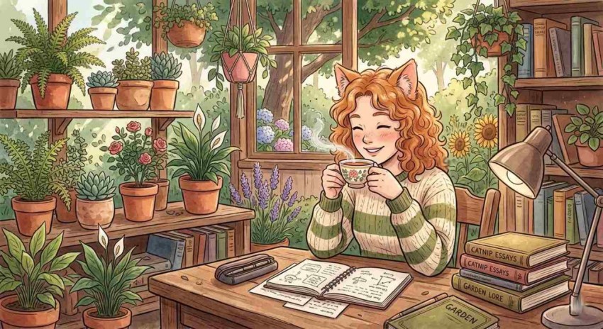 A charming illustration of a cheerful woman with ginger hair and playful cat ears enjoying a warm cup of tea. Surrounded by colorful flowers, lush trees, and potted plants, the scene creates a peaceful and studious atmosphere. The artwork blends cozy aesthetics with whimsical fantasy elements, making it perfect for themes of relaxation, creativity, and calm everyday moments in a vibrant garden setting.