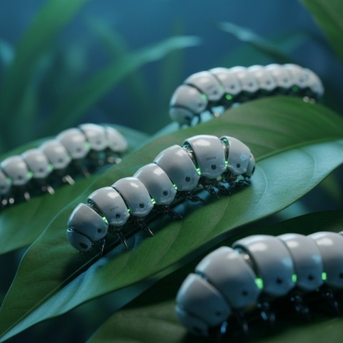Cybernetic Caterpillars Walking on Leaves Futuristic Nature Concept