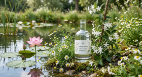 A serene and luxurious scene featuring elegant lotus and jasmine flowers arranged around a glass bottle beside a tranquil pool. This visually calming composition reflects a spa-inspired aesthetic, symbolizing relaxation, wellness, and natural beauty. Perfect for use in aromatherapy branding, skincare promotions, wellness content, and lifestyle visuals, this floral poolside setting creates a soothing and refreshing atmosphere.