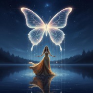 serene night landscape photography young girl standing by a lake night night landscape serene photography golden dress glowing butterfly wings glowing lights digital painting sky water ocean night skySimilar Photos