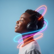 African Boy Listening Music with Bluetooth Neon Waves Around Head