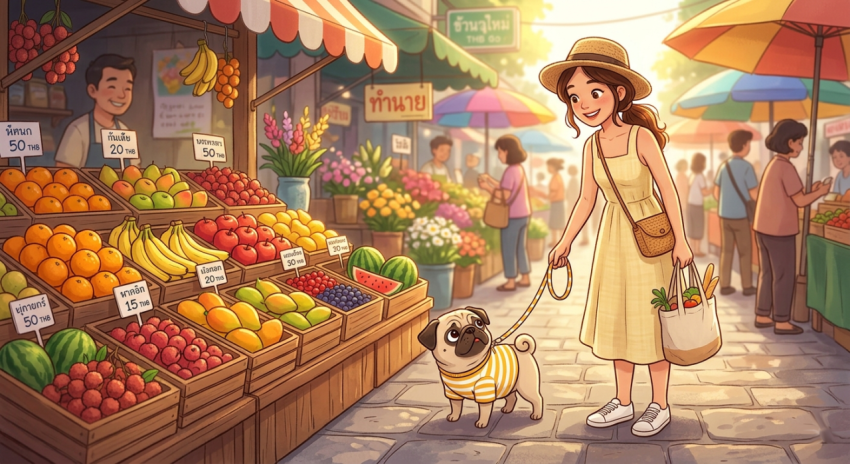 Cute Pug and Girl Walking Through a Colorful Morning Market