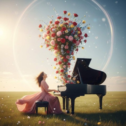 romantic scene cute woman grand piano large magical bouquet colorful flowers wildflowers slowly rises sky performs performance bouquet flying floating heart shpes dreamy poetic field mood girl playing piano beautiful woman playing piano meadow nature music outdoor pianist female musician romantic scenery artistic performance green field classical music concept meadow with flowers outdoor landscape piano music nature peaceful meadow open fieldSimilar Photos