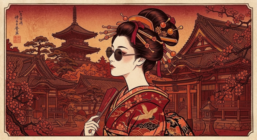 A striking profile portrait of a beautiful Japanese woman wearing a traditional kimono paired with modern sunglasses, set against the backdrop of a classic Japanese temple. Rendered in a traditional Ukiyo-e inspired style with a rich crimson color palette, this artwork blends cultural heritage with contemporary fashion, making it ideal for use in art, fashion, travel, and cultural design projects.