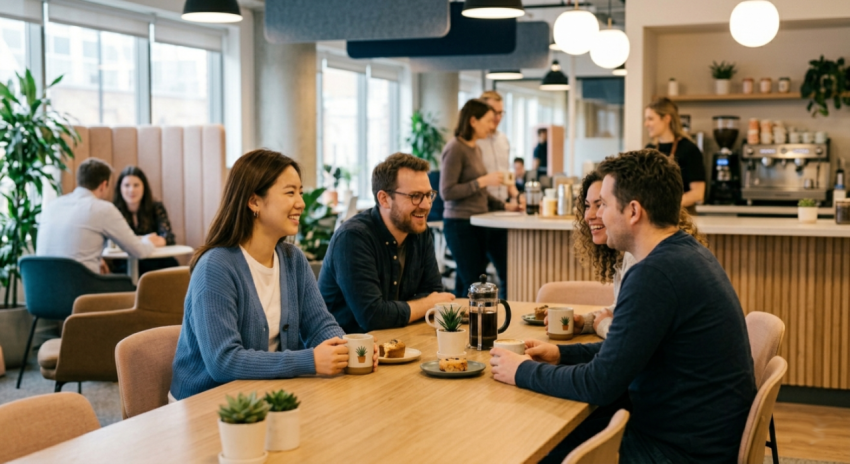 A young professional girl enjoying a coffee break in an office cafeteria alongside other employees. This workplace lifestyle scene captures a relaxed corporate environment, showcasing team interaction, casual moments, and a modern office atmosphere. Perfect for business, productivity, and corporate culture themes.