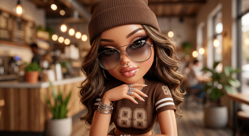 Explore a stunning 18K hyper-realistic 3D digital illustration of a stylish Bratz-inspired young woman leaning toward the camera with a playful smirk. Featuring oversized gradient glasses, long lashes, glossy lips with snake bite piercings, and double nose rings, her bold look is complemented by a brown ribbed beanie and cropped “88” jersey. Warm cinematic lighting highlights her smooth, glowing skin against a soft bokeh indoor background, creating a captivating blend of fashion, attitude, and high-end digital artistry.