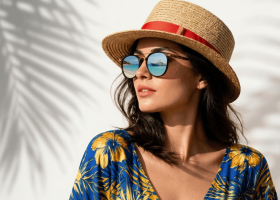 A stylish portrait of a woman wearing a straw hat and reflective sunglasses, dressed in a vibrant tropical outfit. The sunglasses mirror a serene beach scene, adding a travel-inspired touch to the composition. With soft natural lighting and elegant shadows, this image captures the essence of summer fashion, vacation vibes, and modern lifestyle aesthetics—perfect for travel, fashion, and seasonal branding content.